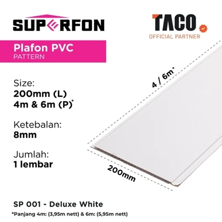 Plafon PVC Superfon adalah solusi praktis dan estetis untuk menghias langit-langit rumah atau ruang komersial. Selain tampilannya yang menarik, Plafon PVC Superfon juga memiliki harga yang terjangkau, menjadikannya pilihan yang ekonomis tanpa mengorbankan kualitas. Terbuat dari material PVC yang tahan lama dan mudah perawatannya, Superfon sangat cocok diaplikasikan sebagai solusi tahan lembab dan bebas rayap.